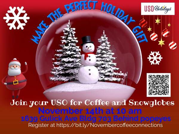 Let’s jump into this holiday season with some coffee and a snow globe craft. Join us at our center November 14th at 10 am. Light refreshments along with all your crafting needs will be provided. This is a great way to get ahead of the holiday season crafts and meet local spouses of Fort Stewart. Please keep in mind you do not have to be new to the area to join. We encourage all spouses in the area to join.