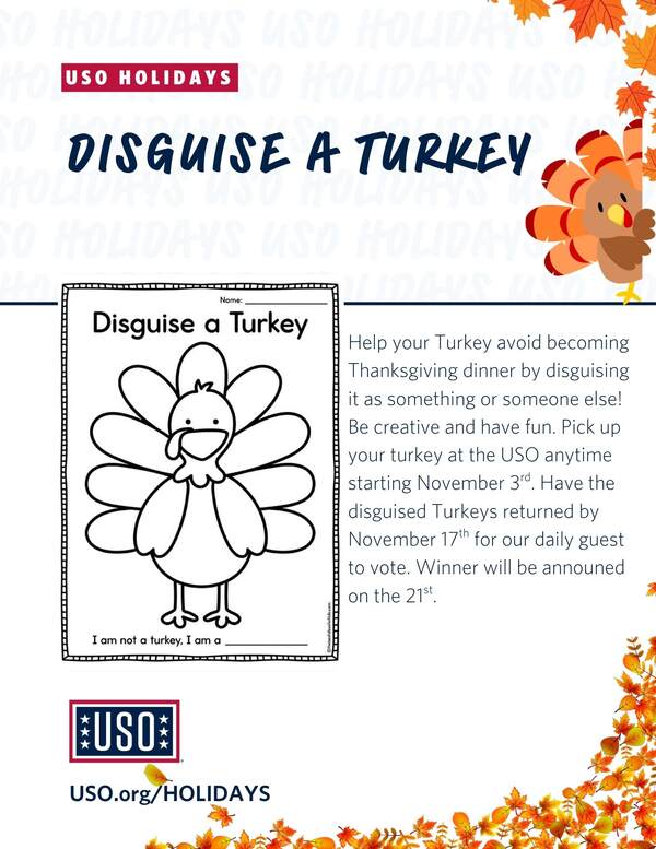 Help your turkey avoid becoming Thanksgiving dinner by disguising it as something or someone else! Be creative and have fun designing your disguise. Pick up your Turkey from our center at 1639 Gulick Ave. starting November 1st-17th. Voting will be conducted by the service members in our center. We can’t wait to see all the designs
