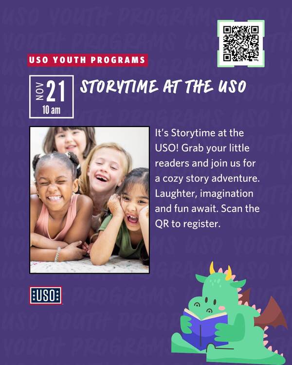 It’s Storytime at the USO! Grab your little readers and join us for a cozy story adventure. Laughter, imagination and fun await.